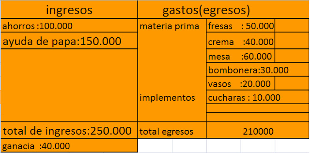 imagina que vas abrir un negocio de venta de fresas con crema y quieres saber con cuanto dinero debes contar para iniciar el presupuesto de este negocio puede ser como el que muestra la tabla