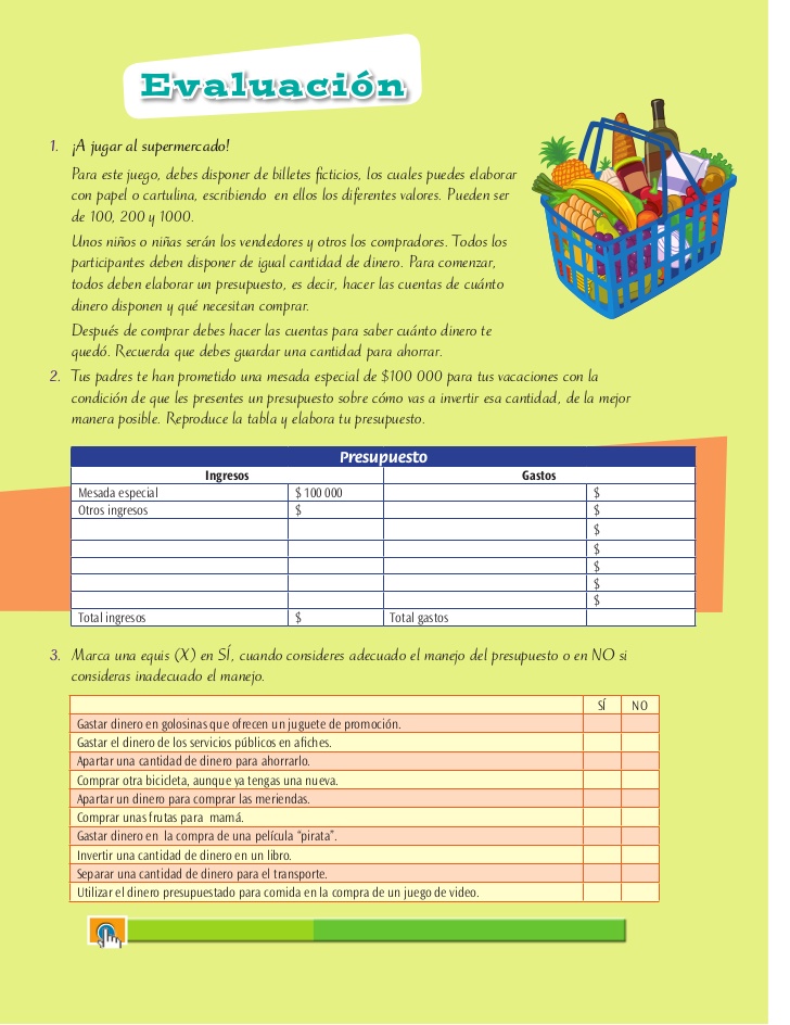 desarrollo1. es importante por que si en alguna ocasión necesitas algo y no tienes plata esa parte de dinero que guardaste te serviría 2. no leva a alcanzar para otras cosas u o otros gastos que serian necesario EVALUACIÓN1.Jugar Al Supermercado